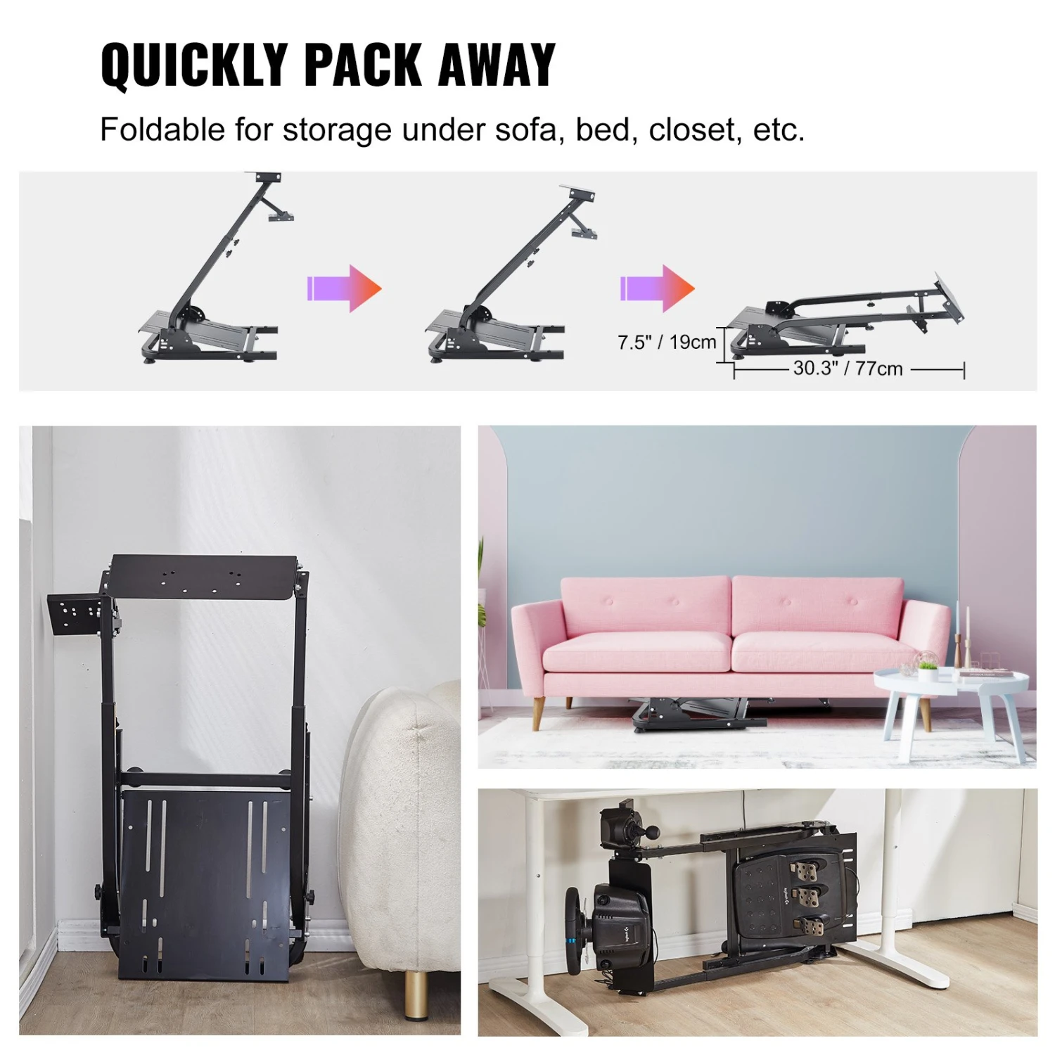 Aufgrund des begrenzten Wohnraums müssen viele Gamer ihre Lenkradständer in Mehrzweckbereichen wie Wohnzimmern, Schlafzimmern oder kleinen Wohnungen aufstellen. Das platzsparende Design eines Lenkradständers ermöglicht es Ihnen, ihn an einem kleinen Ort aufzustellen, wenn er nicht verwendet wird.